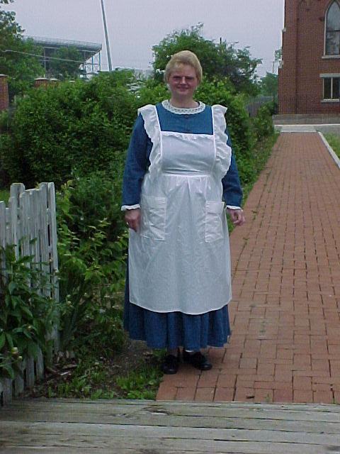 HistoryNot all those who lived in the late Victorian age were able to afford the finer education and homes that we associate with that age. Some, like this lady, were farmers or immigrants, coming to the United States looking for a new life and freedom. They brought with them their hopes and dreams as well as their customs and the styles with which they were comfortable.GarmentOur model is wearing a typical lower and middle class Victorian outfit and is standing outside her farmhouse. The dress is made of homespun material (100% cotton) in a slate blue and gold very subtle plaid and is one piece. Her apron is typical of the German immigrant bib-style that tied in the back and is in white cotton, easy care in a time where there were no washing machines!PricingAs pictured.............................................$100We would not recommend using anything other than cotton, linen or muslin as this outfit would probably not be worn to a fancy dress ball. The prices stated above are guidelines for this outfit. Each ensemble is custom made for you. Prices will vary depending on fabric choice and sewing technique. Hand sewing is available for additional charges. Once initial consultation is completed and fabrics have been chosen a final price will set. Please allow at least 3 weeks from receipt of measurements for completion. Special thanks to our model Kathy |