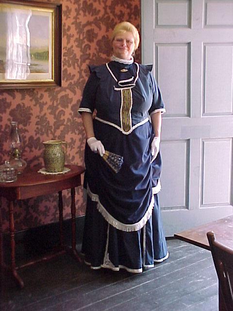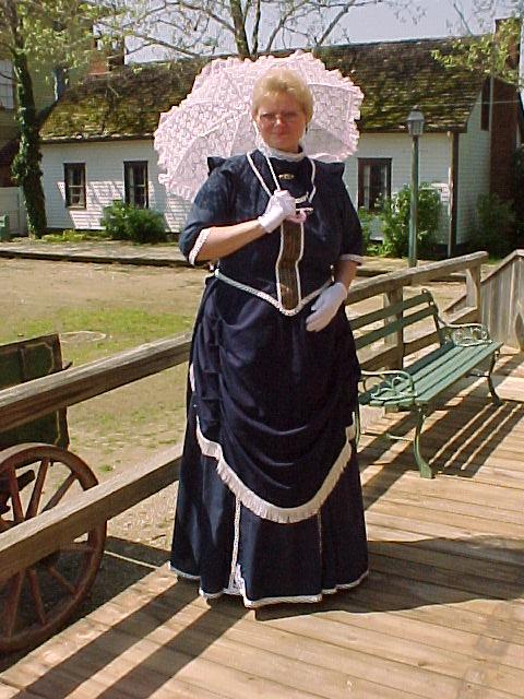 HistoryA proper Victorian day dress, you would find this outfit gracing women during the post-Civil War Era (approx. 1867 to 1875 or 1880) and the beginning of what we associate as the Victorian period in the United States. There are many variations of this basic dress, some with even more trim as this was the time of extravagance. Although some allowances were made for the time of year (in this case the three-quarter length sleeves) most of the bodices would still have had longer sleeves. While the lady in the picture is without her hat, she has donned her gloves and carries her parasol to keep that “nasty sun” off her skin. Our model is posing on the boardwalk of a reproduced Civil War Village at the The Ohio Historical Society during a special Victorian Age public program.Garment DetailsThe dress pictured here was made from solid, dark blue, 100% cotton broadcloth trimmed with white lace and white fringe. It consists of a bodice, underskirt, apron and a variation of the waterfall bustle in the back and was worn over a pillow bustle and 7-gore petticoat. Other materials that could be used would be satin, silk, linen, perhaps even an organza overlay. The front apron might also have been lace. It fastens down the back with pearl buttons and has a high collar. This dress uses between 7 and 8 yards of material.PricingAs pictured above....................................$175Additional and more elaborate trim..........$40 and up (additional charges) The prices stated above are guidelines for this gown. Each gown is custom made for you. Prices will vary depending on fabric choice and sewing technique. Hand sewing is available for additional charges. Once initial consultation is completed and fabrics have been chosen a final price will set. Please allow at least 3 weeks from receipt of measurements for completion. Special thanks to our model Kathy |
