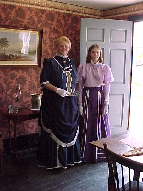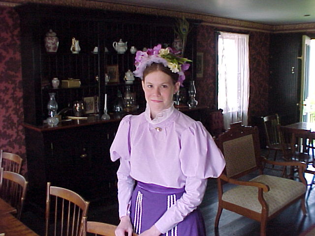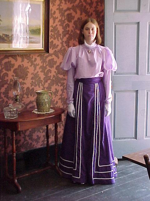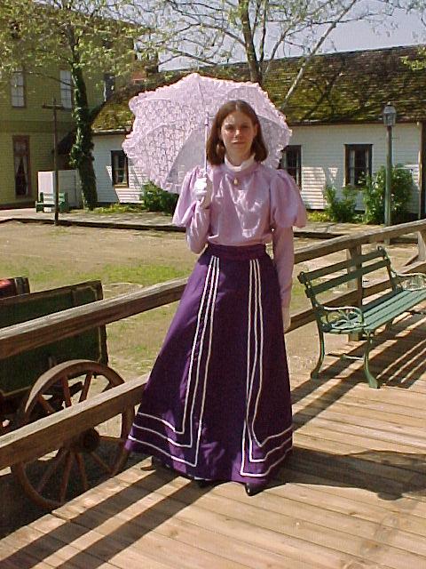 HistoryThe late Victorian period was between 1885 to the turn of the century. This is when the famous “leg-o-mutton” sleeve became popular, sometimes to the extreme. Skirts became less elaborate and consumed less material. Ladies still covered their head when going out (as in the first picture where the young lady sports a hat) and there were more rules for proper behavior than days in the year! Our model Lindsie is pictured in the “Ladies Seminary” which is part of a reproduced Civil War Village at the The Ohio Historical Society during a special Victorian Age public program.GarmentThe model is wearing a typical “Walking Skirt” and simple “leg-o-mutton” blouse that tucks in but still has the proper high neckline. The waist is covered with a coordinating sash. Our young lady prefers the color purple so her blouse is lightweight cotton in a purple gingham check with lace around the wrist and neck and pearl buttons down the back. Her skirt is solid purple broadcloth with three rows of white gimp around the bottom. The skirt was made to wear over a pillow or ruffle bustle and 7-gore petticoat. Again, all materials in the outfit pictured are 100% cotton however linen, seersucker, or even the finer silks and taffetas could be used as well.PricingAs pictured.............................................$100Additional and more elaborate trim..........$40.00 and up (additional charges) The prices stated above are guidelines for this gown. Each gown is custom made for you. Prices will vary depending on fabric choice and sewing technique. Hand sewing is available for additional charges. Once initial consultation is completed and fabrics have been chosen a final price will set. Please allow at least 3 weeks from receipt of measurements for completion. Special thanks to our model Lindsie |