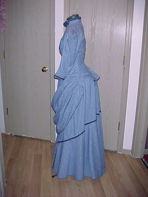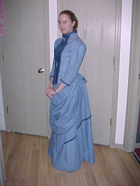 HistoryThis is another example of the late Victorian period (circa 1875 to 1885) style of day dress. The blouse in this period emphasized a small waist and the corsets worn under the clothing were intended to pull the waist in as far as possible. If you have a small waist, as our model is blessed with, the fashion brought attention to what was considered a very fine attribute. However, just as today, many young women did not fit the “profile” so they would go to their doctors and ask them to remove the bottom ribs on both sides of their rib-cage in order to “be fashionable.” So you see, fashion has taken a toll on women’s bodies for centuries!Garment DetailsThis outfit consists of a blouse, underskirt and apron. The blouse has a high collar and contrasting front insert (to make it look like a jacket and vest), three quarter length sleeves and a peplum skirting on the back of the blouse. It fastens down the front (meeting flush at the middle) with hooks and eyes. The underskirt is a basic 7-gore walking skirt that has contrasting front pleats added. The apron is a simple front pleat with a hook and eye fastener in the back (hidden by the blouse peplum). The material used is a 100% cotton calico print with a light blue background and a dark blue cotton broadcloth for the contrast. Dark blue fancy gimp outlines the edges of the sleeve, part of the collar, and the seams on the back of the walking skirt (to emphasize the additional material needed to go over the bustle. It is being worn over a simple 100% off white cotton broadcloth petticoat and a pillow bustle. The young lady is now dressed in the proper way to be out in public at a summer Victorian picnic.PricingAs pictured above.............................................................$150The prices stated above are guidelines for this garment. Each garment is custom made for you. Prices will vary depending on fabric choice and sewing technique. Hand sewing is available for additional charges. Once initial consultation is completed and fabrics have been chosen a final price will set. Please allow at least 3 weeks from receipt of measurements for completion. Special thanks to our model Jennifer |