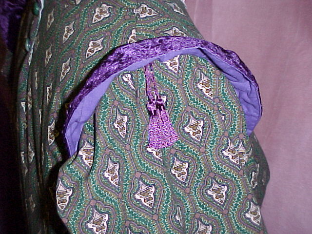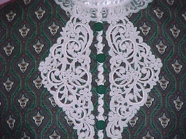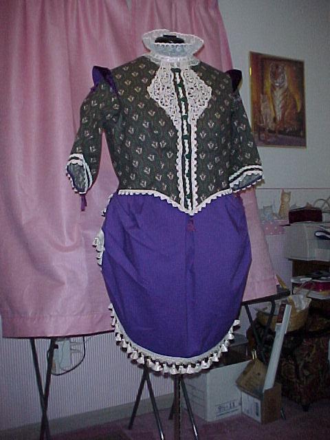 HistoryThe late Victorian period (circa 1875 to 1900) was time of the industrialization of Great Britain and the United States. With the machines came leisure time and affluence and the affluence was shown off by the “gingerbread” on the Queen Anne architecture and “more is wonderful” on clothing. The basic top was trimmed with lace, fringe, and fancy buttons. A basic 7-gore skirt was topped by an apron in the front and bustle of ever increasing sizes in the back. Instead of increasing the hip area in the round or elliptical manner that was seen during the Civil War, it now became fashionable to have a flatter front and more out the back. At one point, the back bustle extended so far out you could balance a plate on it! However, for as much as the clothing sometimes went to extravagant levels, society set strict and sometimes very restrictive rules for women’s wear.Garment DetailsThe blouse and apron pictured here were made to complete an outfit for a Victorian event. The skirt had already been made by the wearer in the same material as the blouse. This material is a 100% cotton with a green background and a purple and gold print. For this blouse, the client wanted to make sure that the pattern was going down “like chandeliers.” The ruffle shown in the third picture is purple velveteen with a purple cotton underling; the same purple cotton that was used to make the front apron. The blouse has a peplum in the back with a purple cotton lining (not shown) and a high collar. The apron has an off-white ball fringe around the edges. The middle picture shows detail of the lace used on the front of the blouse. The completed outfit would be worn over a chemise, corset (of slightly different style from the Civil War corset), a pillow, ruffle or cage bustle.PricingAs pictured above (blouse and apron).................................$95Full outfit in 100% Cotton.................................................$150 - $250 and up (dependent on trim and bustle choices) Full outfit in high-end fabrics(taffeta, satin, silk..................$250 - $500 and up (dependent on trim and bustle choices) The prices stated above are guidelines for this garment. Each garment is custom made for you. Prices will vary depending on fabric choice and sewing technique. Hand sewing is available for additional charges. Once initial consultation is completed and fabrics have been chosen a final price will set. Please allow at least 3 weeks from receipt of measurements for completion. |