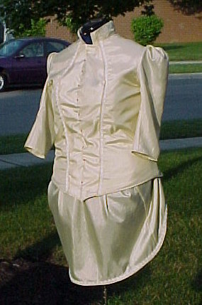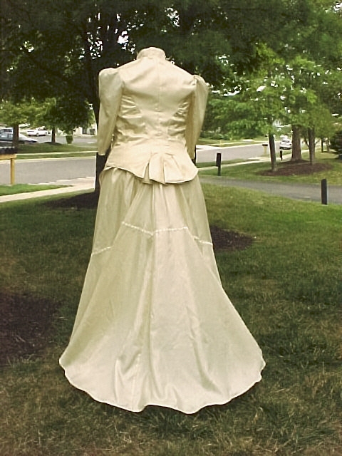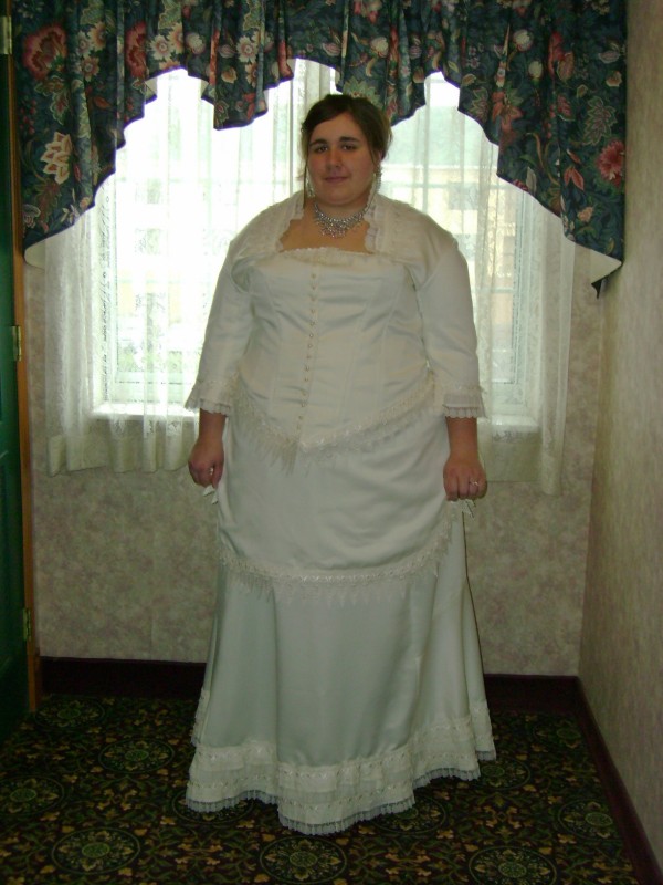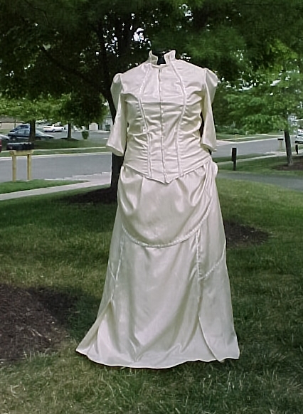 HistoryThe late Victorian period was a time of excess, in architecture, in decorating the home, and also with the more elaborate trims and lace for more formal dresses. Wedding parties still followed the tradition of the bridesmaid's dress looking very much like the bride's dress however, as it got closer to the turn of the century, the tradition of the bride wearing white became more common. Our model, Tiffany, wanted a late Victorian dress for her period wedding taking place in the beautiful chapel at the Ohio Historical Society's Ohio Village in Columbus, Ohio.Garment DetailsThe material used in this dress was an off-white polyester crepe material with natural color Venice Lace trim. There were three styles of Venice lace used in the bodice and skirt, as well as a pre-pleated cotton and lace trim at the bottom of the skirt. The Bodice has a portrait neckline that is edged with the pleated trim and Venice lace accent and three-quarter length sleeves. Pearl buttons run down the front to the pointed bottom and the back has a short peplum that sits on top of the bustle. Bonig was used extensively to create a true reproduction look. The skirt was a basic 7 gore skirt with two rows of pleated trim around the bottom. Both it and the apron fasten in the back with hooks and eyes. The apron also has an edging consisting of two different styles of Venice lace and has the added comfort of a simple once-over tie before cascading into the two "tails" down the back. The apron was self lined so that the tails would fall just right with the lace showing on either front or back. Our bride was also outfitted with the "proper undergarments" consisting of a corset, flounced petticoat and gathered bustle. |