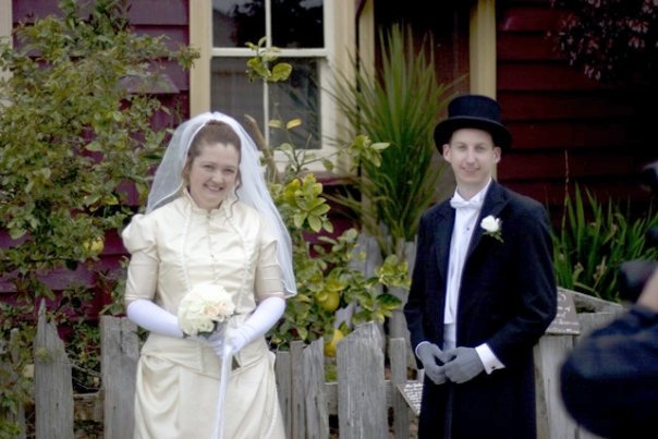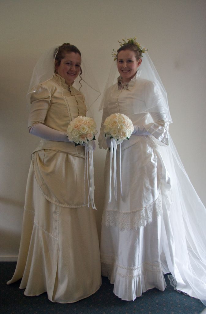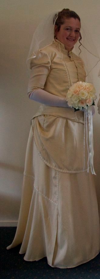 HistoryAt a proper Victorian wedding, the bridesmaid's dress would be very similar to the bride's, sometimes differing only in color and a few embellishments. On many occasions one could not tell the bride from the maid of honor! In this case, Lisa is the Maid of Honor in the champagne colored dress above. This is an example of late Victorian style, with a small bustle back. Some gowns from this era had even more trim as this was a time of extravagance. Suzanne's wedding was celebrated at Howick Historical Village, in Howick, Auckland New Zealand, and we were proud to make this dress for Lisa to help celebrate Suzanne's special day. Garment DetailsThe dress pictured here was made from champagne silk, trimmed with a small floral Venice lace trim. The bodice is buttoned down the front with pearl buttons and has a high collar. The skirt and apron fastens with hooks and eyes in the back. The entire outfit consists of a bodice, underskirt, and apron and was worn over a pillow bustle and 7-gore petticoat. Other materials that could be used would be satin, silk, linen, perhaps even an organza overlay. The front apron might also have been lace. This dress uses between 7 and 8 yards of material. |